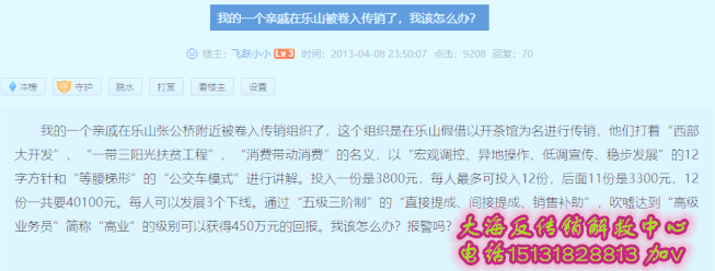 外地人小郑的妈妈、妹妹就被涉传组织成功洗脑。几个月前,母女俩被骗到乐山搞传销,小郑本人也差点被妹妹拉入伙。“我感觉她们做的事,很像大家说的传销。”小郑劝母亲和妹妹离开,但遭到拒绝,母亲和妹妹还要求他也留下。无可奈何之际,小郑在19日晚遇到了第四清查组,赶紧上前讲明情况并求助。8月20日,在清查人员的帮助下,小郑和母亲、妹妹终于踏上回家之路。但遗憾的是,这短短几个月里,这母女俩已经被骗了10多万元。