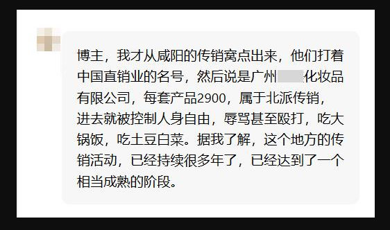 这是近期,一位网友被骗陕西咸阳北派传销组织的亲身经历。