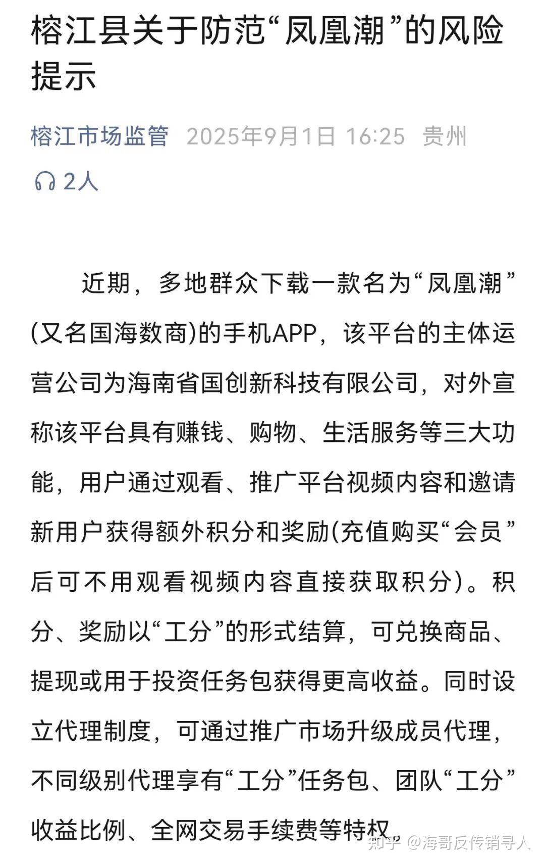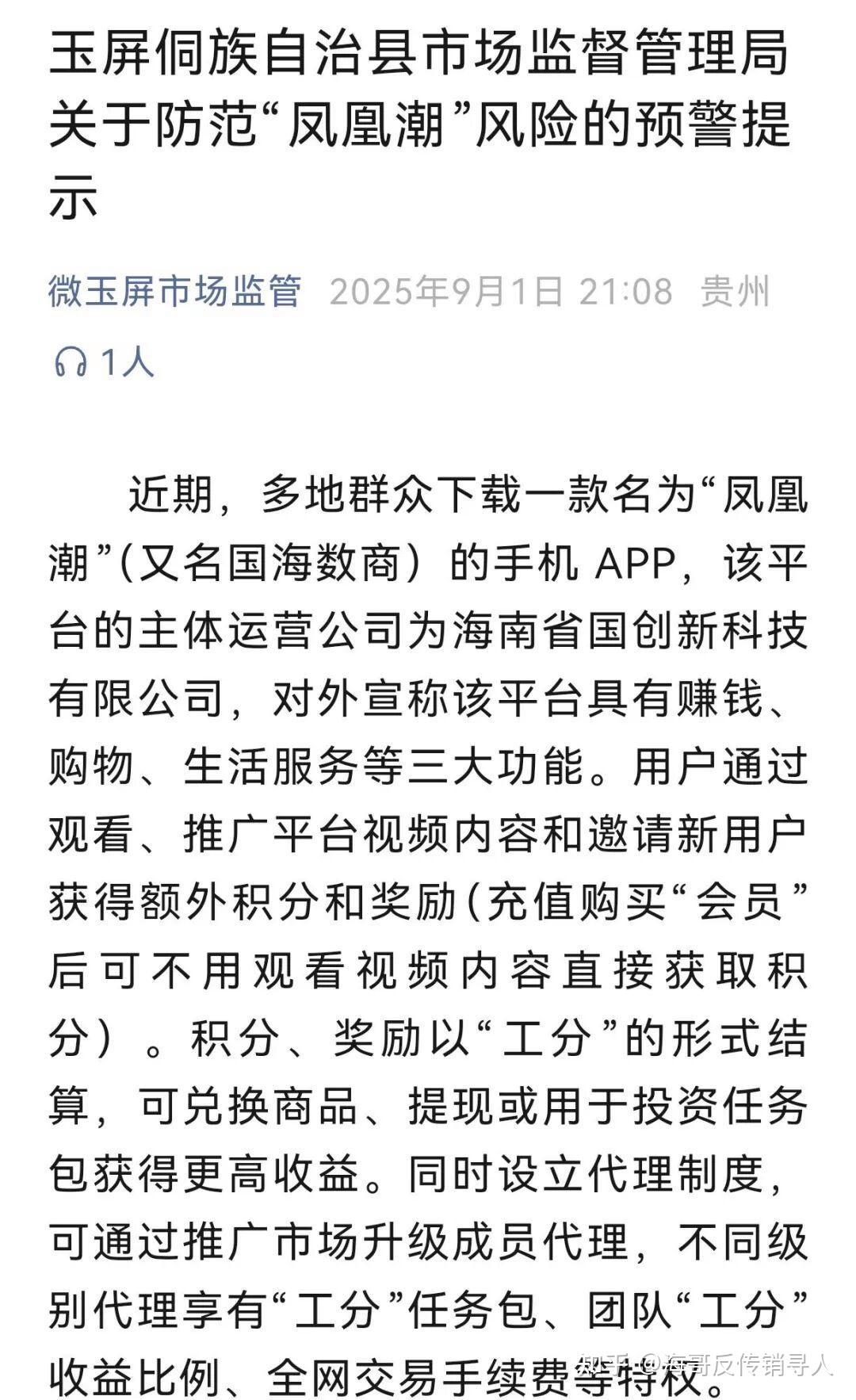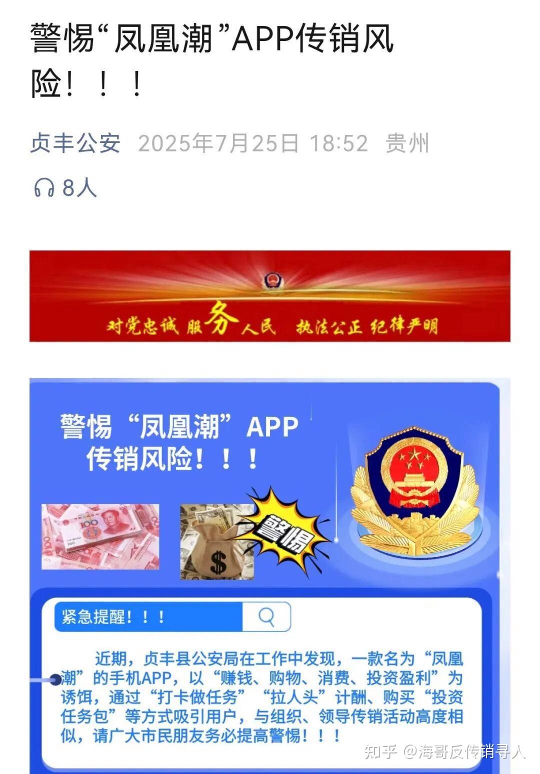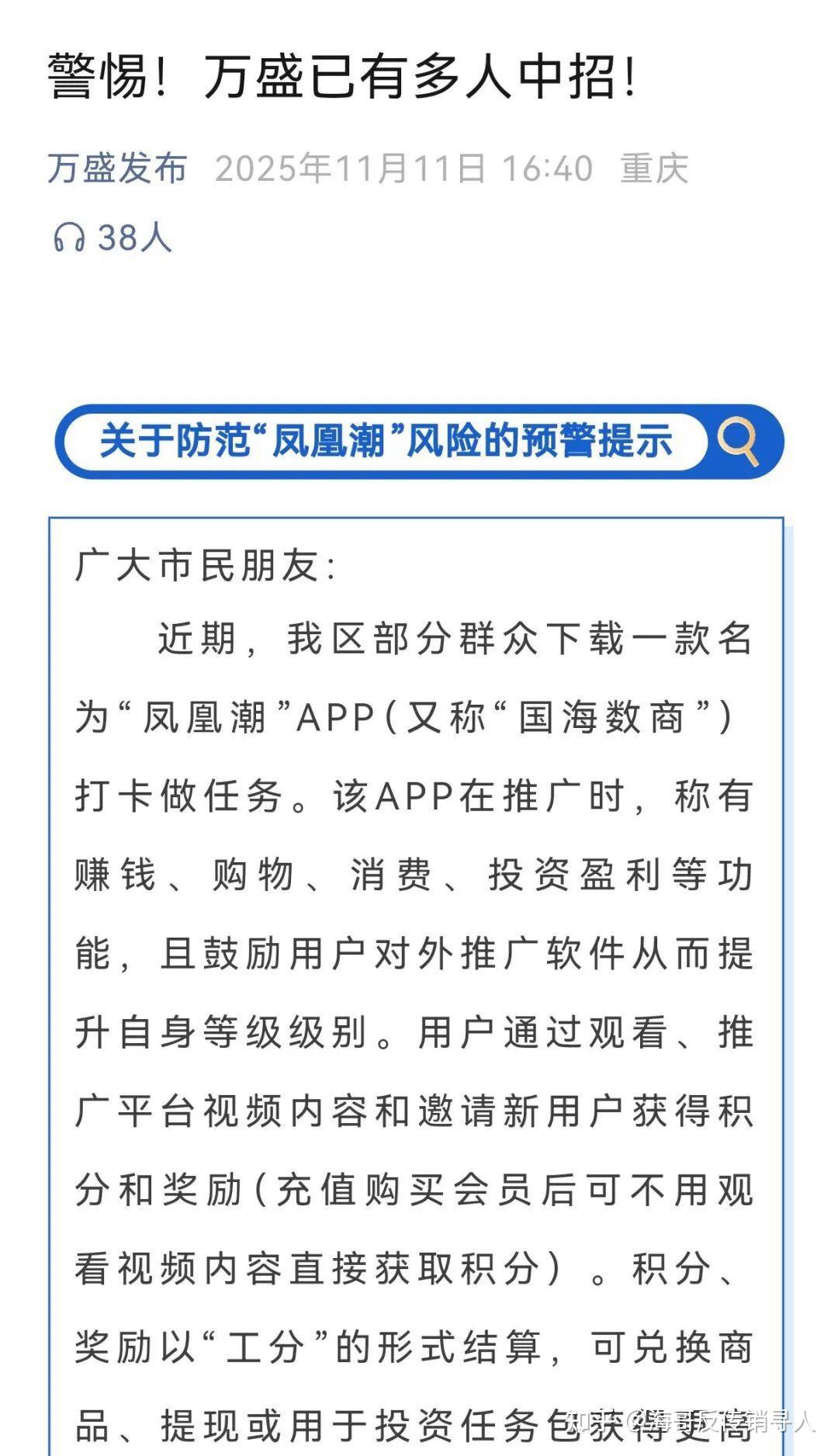 此外今年,“凤凰潮”APP被贵州多地通报,发布“涉嫌传销”的风险提示。近期,重庆“万盛发布”也发布了关于防范“凤凰潮”风险的预警提示。