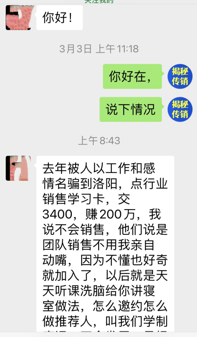 洛阳传销受骗者:去年被人以工作和感情名骗到洛阳,点行业销售学习卡,交3400,赚200万,我说不会销售,他们说是团队销售不用我亲自动嘴,因为不懂也好奇就加入了。