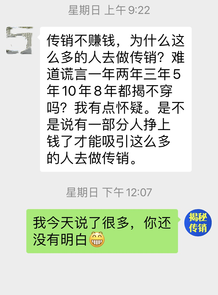 有网友问:传销不赚钱,为什么这么多的人去做传销?难道谎言一年两年三年5年10年8年都接不穿吗?我有点怀疑。是不是说有一部分人挣上钱了才能吸引这么多的人去做传销。