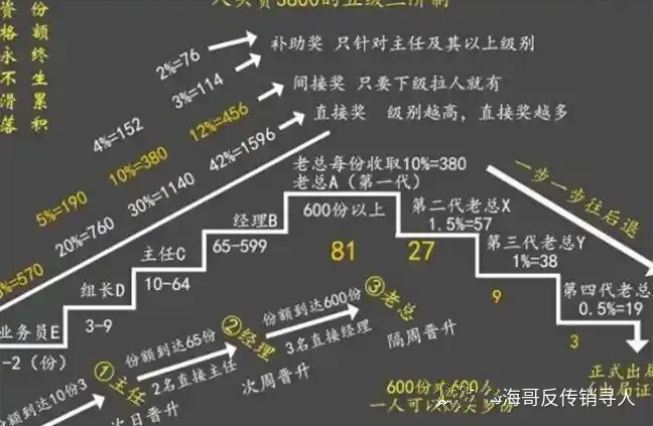 他们利用组织里面的一套经营模式(五级三晋制,金字塔模式)来告诉新人,行业百分之一百能赚到钱,让新人明白这就是一个排着队拿钱的项目。