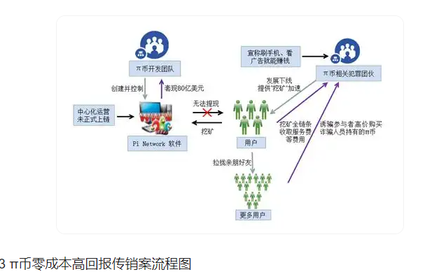 π币零成本高回报传销骗局。2019年3月,尼古拉斯·科卡里斯(Nicolas Kokkalis)等人自称毕业于斯坦福大学,以区块链技术、虚拟货币为幌子,启动Pi Network项目。π币传销骗局宣称“刷手机、看广告就能赚钱”和“手机点点就能挖矿”,而事实上诈骗团伙在“挖矿”全链条的各个环节收取服务费等费用,以提供“挖矿”加速奖励为由,让参与者诱导更多新人加入,用户邀请的人越多,活跃用户越多,“挖矿”速度就越快,邀请人与受邀人必须同时完成任务以获得加速奖励。同时,π币一直以中心化方式运营,从未正式上链,用户变现障碍重重以致无法提现。2025年7月,Pi Network团队被指控抛售1200万枚π币,套现80亿美元跑路。2022年以来,国内已有多起与π币相关的传销、诈骗案件被法院判决,但均为地方团伙而非Pi network核心开发团队本身,在江苏某案件中,犯罪团伙以“π币挖矿”为幌子,涉案金额超2亿元。