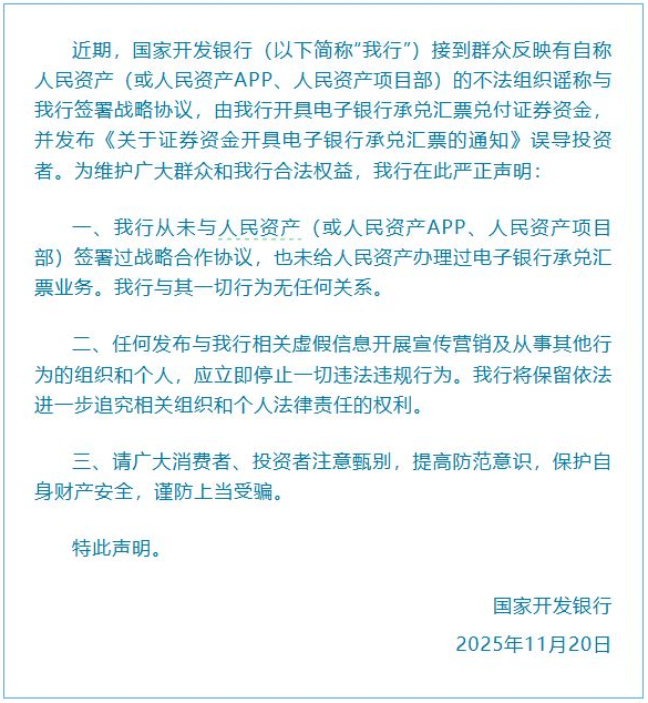 国开行近期接到群众反映,有自称“人民资产”(或“人民资产”App、“人民资产”项目部)的不法组织谣称与该行签署战略协议,由该行开具电子银行承兑汇票兑付证券资金,“人民资产”还发布《关于证券资金开具电子银行承兑汇票的通知》误导投资者。