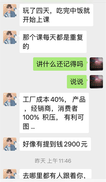 网友说,每天下午都上课,反复讲一些相同内容,如40%的工厂成本,产品,经销商,消费者,通过网友描述,大海反传销老师判断应该是一个北派传销团伙。