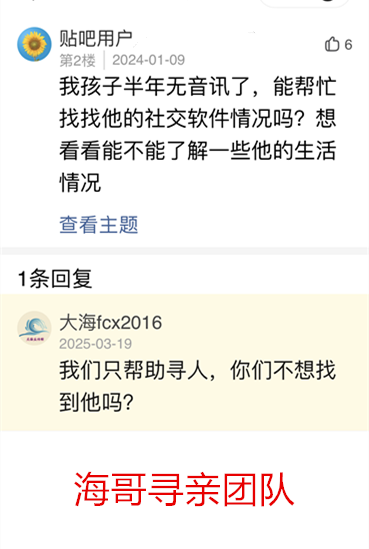 上面是一位家属的咨询,孩子半年没有音讯,这个家属说想要了解一下孩子的生活情况,海哥寻亲猜想,可能是因为家庭矛盾离家出走原因吧。