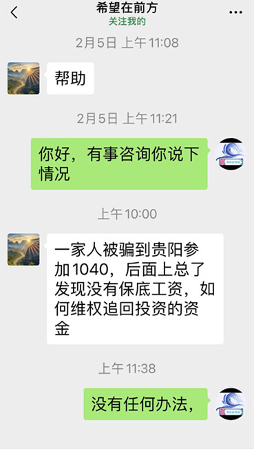 最近,又网友问:一家人被骗到贵阳参加1040,后面上总了发现没有保底工资,如何维权追回投资的资金。