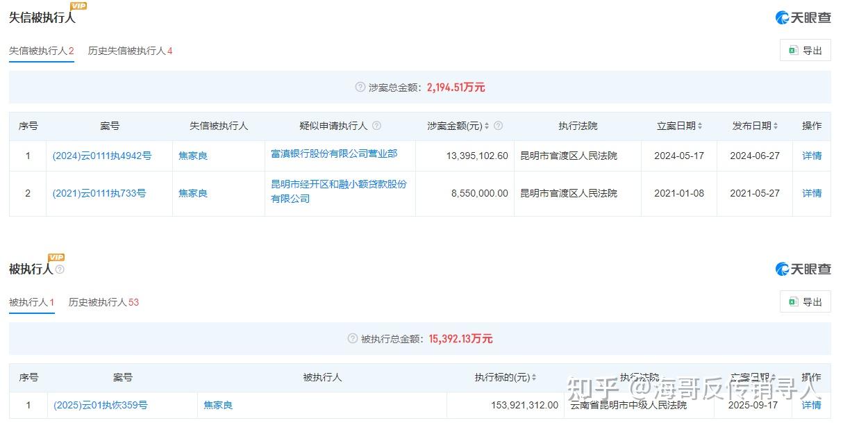 也就是说,理想华莱深陷传销旋涡,公司也成为被执行人,股权遭到冻结。实控人焦家良同样如此,两笔涉案2000余万元的诉讼让其成为“老赖”。焦家良历史被执行人的4笔涉案金额,则超过了5亿元,即失信被执行人涉案金额合计约5.4亿元