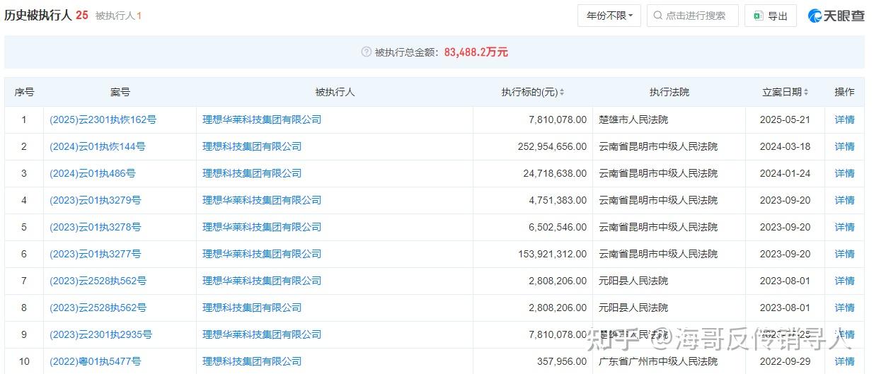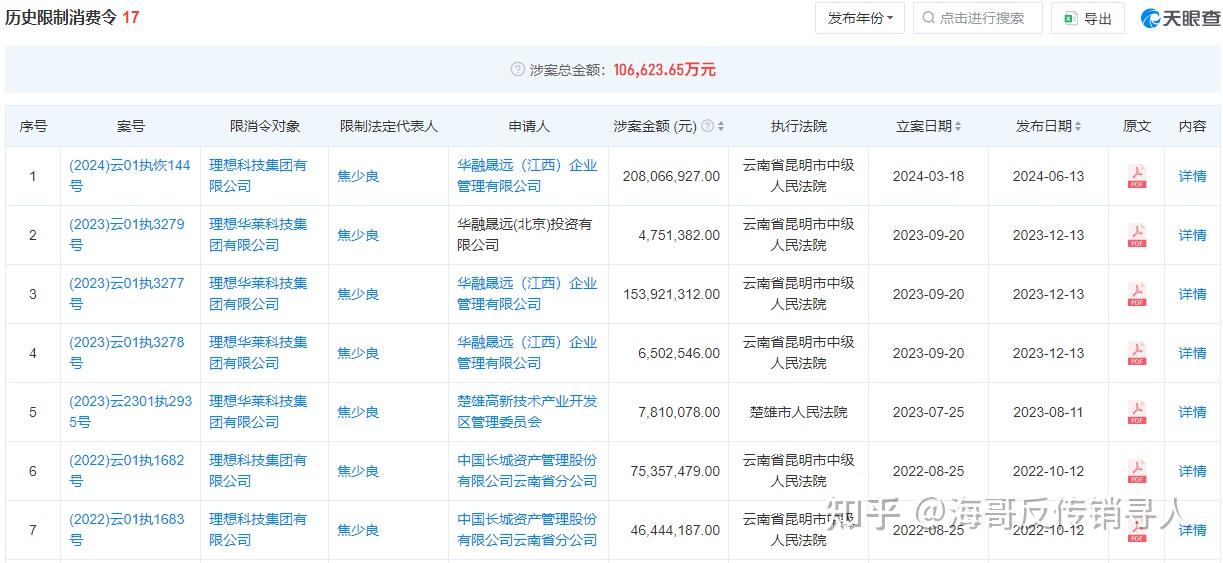 经《财中社》统计,理想华莱在历史失信被执行人和历史限制消费令中合计出现了20次,涉案金额合计达到12.3亿元。