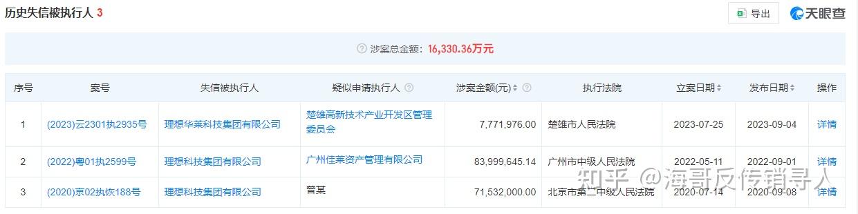除了历史限制消费令名单,理想科技集团有限公司以及更名成为理想华莱后,公司又3次成为历史失信被执行人,合计金额达到1.6亿元,涉案时间从2020年到2023年。